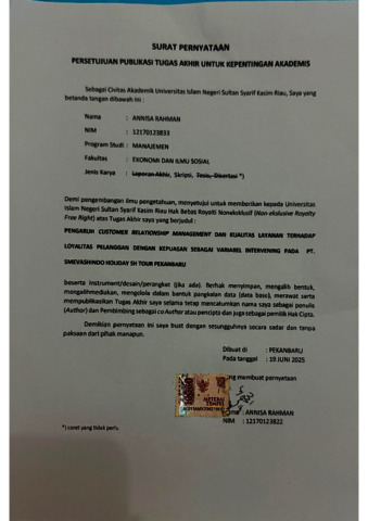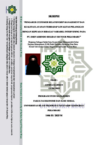 ABSTRAK “PENGARUH CUSTOMER RELATIONSHIP MANAGEMENT DAN KUALITAS LAYANAN TERHADAP LOYALITAS PELANGGAN DENGAN KEPUASAN SEBAGAI VARIABEL INTERVENING Pada PT. Smevashindo Holiday SH Tour Pekanbaru” Oleh : ANNISA RAHMAN 12170123833 Tingginya tingkat persaingan dalam industri jasa perjalanan umrah menuntut perusahaan untuk dapat mempertahankan pelanggan serta menciptakan kepuasan agar tercipta loyalitas yang berkelanjutan. Penelitian ini bertujuan untuk mengetahui pengaruh Customer Relationship Management (CRM) dan kualitas layanan terhadap loyalitas pelanggan dengan kepuasan pelanggan sebagai variabel intervening pada PT. Smevashindo Holiday SH Tour Pekanbaru. Sampel pada penelitian ini menggunakan teknik purposive sampling, yaitu jamaah umrah SH Tour Pekanbaru yang telah melakukan perjalanan umrah dua kali atau lebih. Metode analisis data menggunakan Partial Least Square (PLS) dengan bantuan software SmartPLS 3.3.3. Hasil penelitian menunjukkan bahwa CRM dan kualitas layanan berpengaruh positif dan signifikan terhadap kepuasan pelanggan. Kepuasan pelanggan juga berpengaruh positif dan signifikan terhadap loyalitas pelanggan. Namun, kedua variabel tersebut memiliki pengaruh tidak langsung yang signifikan terhadap loyalitas melalui kepuasan pelanggan sebagai variabel intervening. Temuan ini menegaskan bahwa kepuasan pelanggan memiliki peran penting dalam menjembatani pengaruh CRM dan kualitas layanan terhadap loyalitas pelanggan dalam konteks jasa perjalanan umrah. Kepuasan pelanggan mendorong terbentuknya loyalitas yang berkelanjutan. Dengan penerapan CRM dan kualitas layanan yang optimal, perusahaan dapat meningkatkan kepuasan yang berujung pada loyalitas pelanggan. Hal ini menjadi strategi penting bagi PT. Smevashindo Holiday SH Tour Pekanbaru dalam mempertahankan pelanggan di industri perjalanan umrah. Kata Kunci: Customer Relationship Management, Kualitas Layanan, Kepuasan Pelanggan, Loyalitas Pelanggan, Partial Least Square.