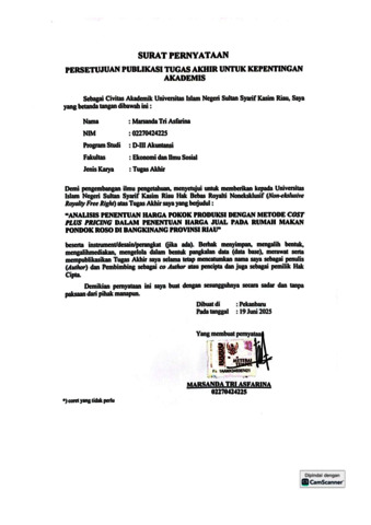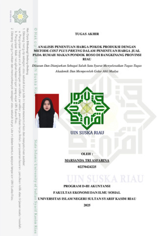 ABSTRAK ANALISIS PENENTUAN HARGA POKOK PRODUKSI DENGAN METODE COST PLUS PRICING DALAM PENENTUAN HARGA JUAL PADA RUMAH MAKAN PONDOK ROSO DI BANGKINANG PROVINSI RIAU Oleh : Marsanda Tri Asfarina NIM : 02270424225 Usaha Rumah Makan Pondok Roso merupakan usaha yang bergerak dibidang kuliner. Dari hasil penelitian ini terdapat permasalahan yaitu dalam penentuan harga pokok produksi, Rumah Makan Pondok Roso belum melakukan perhitungan harga pokok produiksi secara terperinci seperti biaya overhead pabrik. Selama ini, Usaha Rumah Makan Pondok Roso menentukan harga pokok produksinya berdasarkan intuisi atau perkiraan pemilik usaha. Tujuan penelitian ini adalah untuk mengetahui penentuan harga pokok produksi sebelum dan sesudah dengan menggunakan metode cost plus pricing. Metode yang digunakan adalah deskriptif kualitatif yaitu metode analisis data yang didapat secara langsung kepada pihak-pihak yang terlibat dalam penelitian. Teknik pengumpulan data primer dilakukan secara langsung dan data ini didapat secara langsung dari hasil observasi,wawancara kepada pemilik usaha, teknik pengumpuln data sekunder tidak dilakukan secara langsung dari objek, data ini diperoleh melalui sumber seperti internet,jurnal,peneliti terdahulu dan buku.teknik analisis data yang digunakan dalam penentuan harga pokok adalah dengan metode cost plus pricing. Berdasarkan hasil penelitian, harga jual yang berlaku saat ini lebih rendah dibandingkan harga jual dengan metode cost plus pricing. Dikarenakan harga pokokproduksinya lebih besar dari perkiraan pemilik usaha. Rumah makan pondok roso juga belum menghitung biaya overhead pabrik. Kata kunci: Harga Pokok Produksi, Harga Jual, Cost Plus Pricing