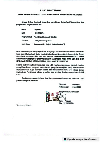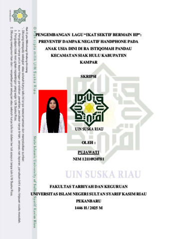 PUJAWATI, - (2025) PENGEMBANGAN LAGU “IKAT SEKTIF BERMAIN HP”: PREVENTIF DAMPAK NEGATIF HANDPHONE PADA ANAK USIA DINI DI RA ISTIQOMAH PANDAU KECAMATAN SIAK HULU KABUPATEN KAMPAR. Skripsi thesis, UNIVERSITAS ISLAM NEGERI SULTAN SYARIF KASIM RIAU.