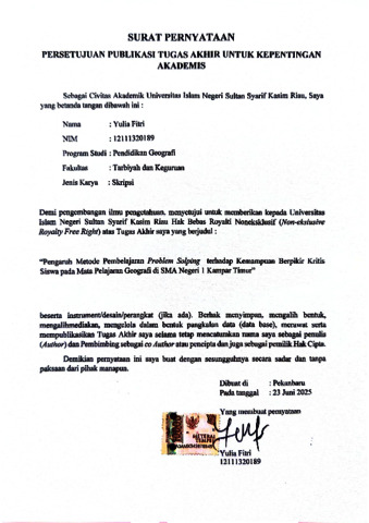 YULIA FITRI, - (2025) PENGARUH METODE PEMBELAJARAN PROBLEM SOLVING TERHADAP KEMAMPUAN BERPIKIR KRITIS SISWA PADA MATA PELAJARAN GEOGRAFI DI SMA NEGERI 1 KAMPAR TIMUR. Skripsi thesis, UNIVERSITAS ISLAM NEGERI SULTAN SYARIF KASIM RIAU.