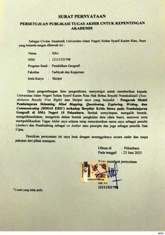 SILVI, - (2025) PENGARUH MODEL PEMBELAJARAN SKIMMING, MIND MAPPING, QUESTIONING, EXPLORING, WRITING, DAN COMMUNICATING (SIMAS ERIC) TERHADAP BERPIKIR KRITIS SISWA PADA PEMBELAJARAN GEOGRAFI DI SMA NEGERI 15 PEKANBARU. Skripsi thesis, UNIVERSITAS ISLAM NEGERI SULTAN SYARIF KASIM RIAU.
