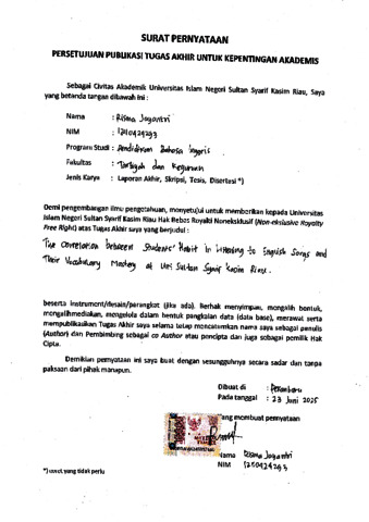 ABSTRAK Risma Jayantri, (2025): “Hubungan antara Kebiasaan Mahasiswa dalam Mendengar Lagu Bahasa Inggris dan Penguasaan Kosakata Mereka di UIN Sultan Syarif Kasim Riau ” Tujuan dari penelitian ini adalah untuk mencari hubungan korelasi antara kebiasaan mendengar lagu bahasa inggris dengan penguasaan kosakata mahasiswa di jurusan Pendidikan Bahasa Inggris. Penelitian ini bersifat korelasi kuantitatif. Sampel yang diambil sebanyak 55 mahasiswa dengan menggunakan purposive sampling. Dalam mengumpulkan data,peneliti menyebarkan angket kepada responden untuk mengetahui kebiasaan mahasiswa dalam mendengarkan lagu berbahasa inggris, yang terdiri dari 21 item pernyataan yang disusun berdasarkan indicator. Untuk mengetahui penguasaan dalam kosakata mahasiswa, peneliti memberi tes yang terdiri dari 25 soal yang berbentuk pilihan ganda dan disusun sesuai indikator. Peneliti menggunakan teknik analisis data yang digunakan adalah signifikan Korelasi melalui SPSS 23. Hasil signifikan korelasi menunjukkan bahwa nilai sig (2-tailed) sebesar 0.000 < 0.05 yang berarti terdapat korelasi yang signifikan terhadap kebiasaan mendengar lagu bahasa inggris dengan penguasaan kosakata mereka. Kesimpulannya, hipotesis nol (Ho) atau tidak ada perbedaan yang signifikan dari kebiasaan mendengar lagu bahasa inggris dengan penguasaan kosakata mereka, ditolak dan hipotesis alternatif (Ha) atau ada korelasi yang signifikan dari kebiasaan mendengar lagu bahasa inggris dengan penguasaan kosakata mereka, diterima.