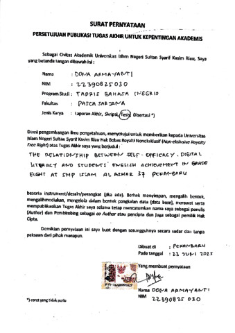 DONA ARMAYANTI, - (2025) THE RELATIONSHIP BETWEEN SELF-EFFICACY, DIGITAL LITERACY AND STUDENTS’ ENGLISH ACHIEVEMENT IN GRADE EIGHT AT SMP ISLAM AL AZHAR 37 PEKANBARU. Thesis thesis, UNIVERSITAS ISLAM NEGERI SULTAN SYARIF KASIM RIAU.