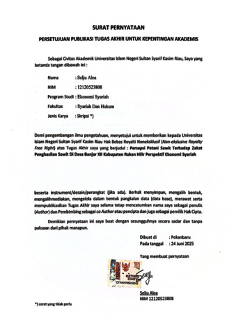 SELJU ALEA, - (2025) PERSEPSI PETANI SAWIT TERHADAP ZAKAT PENGHASILAN SAWIT DI DESA BANJAR XII KABUPATEN ROKAN HILIR PERSPEKTIF EKONOMI SYARIAH. Skripsi thesis, UNIVERSITAS ISLAM NEGERI SULTAN SYARIF KASIM RIAU.