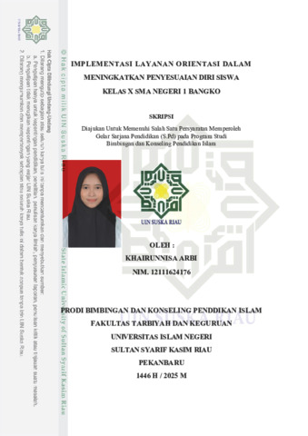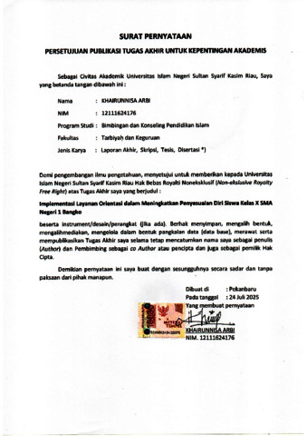"ABSTRAK Khairunnisa Arbi, (2025) : Implementasi Layanan Orientasi dalam Meningkatkan Penyesuaian Diri Siswa Kelas X SMA Negeri 1 Bangko Penelitian ini bertujuan : Mengetahui 1) Implementasi layanan orientasi dalam meningkatkan penyesuaian diri siswa X. 2) Faktor pendukung dan penghambat implementasi layanan orientasi dalam meningkatkan penyesuain diri siswa kelas X SMA Negeri 1 Bangko. Jenis penelitian ini adalah deskriptif kualitatif. Informan penelitian 1 guru BK dan 3 siswa. Teknik pengumpulan data menggunakan pedoman wawancara dan dokumentasi. Teknik analisis data menggunakan reduksi data penampilan data dan penarikan kesimpulan. Hasil penelitian ini menunjukan bahwa. 1) Implementasi layanan orientasi dalam meningkatkan penyesuaian diri siswa yaitu berupa. (a) Perencanaan layanan orientasi guru BK telah menyusun perencanaan layanan orientasi secara sistematis , yang didukung oleh teori dan penelitian yang relevan. (b) Pelaksanaan layanan orientasi dilaksanakan sesuai dengan perencanaan dan melibatkan pihak sekolah. (c) Evaluasi di lakukan ketika semua kegiatan telah selesai. (d) Mampu mengelola emosi, guru BK telah memberikan materi terkait emosi. (e) Mampu berempati terhadap orang lain, bersikap empati dengan teman sebaya. (f) Memiliki motivasi berprestasi bisa membuat siswa menjadi semangat untuk berprestasi. (g) Tidak bergantung dengan orang lain, bisa memiliki kemandirian tanpa harus melibatkan orang lain. (2) faktor pendukung dan faktor penghambat Implementasi layanan orientasi dalam meningkatkan penyesuaian diri siswa. Faktor pendukungnya (a) kerjasama antara guru BK, guru wali kelas, dan guru matapelajaran. (b) komunikasi guru BK dan siswa. Adapun faktor penghambatnya (a) kurangnya dukungan orang tua. (b) kerahasiaan antara guru guru masih longgar. Kata Kunci. Implementasi, Layanan Orientasi, Penyesuaian diri. "