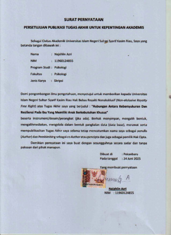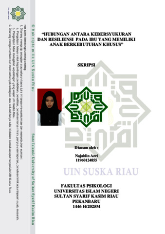 NAJAHLIN AZRI (2025) HUBUNGAN ANTARA KEBERSYUKURAN DAN RESILIENSI PADA IBU YANG MEMILIKI ANAK BERKEBUTUHAN KHUSUS. Skripsi thesis, Universitas Islam Negeri Sultan Syarif Kasim Riau.