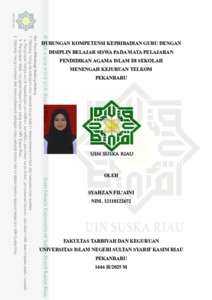 ABSTRAK Syahzan Fil’aini, (2025): Hubungan Kompetensi Kepribadian Guru dengan Disiplin Belajar Siswa pada Mata Pelajaran Pendidikan Agama Islam di Sekolah Menengah Kejuruan Telkom Pekanbaru Penelitian ini bertujuan untuk menguji hubungan kompetensi kepribadian guru dengan disiplin belajar siswa pada mata pelajaran Pendidikan Agama Islam di Sekolah Menengah Kejuruan Telkom Pekanbaru. Jenis penelitian ini adalah penelitian korelasi dengan pendekatan kuantitatif. Populasi dalam penelitian ini adalah 191 siswa dan sampel penelitian berjumlah 129 dengan menggunakan rumus slovin. Teknik pengambilan sampel menggunakan proportionated stratified random sampling. Pengumpulan data dengan menggunakan angket dan dokumentasi. Teknik analisis data menggunakan uji korelasi product moment. Hasil penelitian diperoleh rhitung 0,413 > rtabel 0,172 pada taraf signifikansi 5%, nilai signifikansi 0,000 < 0,05, dengan demikian Ha diterima dan H0 ditolak. Hal ini berarti terdapat hubungan yang signifikan antara kompetensi kepribadian guru dengan disiplin belajar siswa pada mata Pelajaran Pendidikan Agama Islam di Sekolah Menengah Kejuruan Telkom Pekanbaru. Kata Kunci: Kompetensi Kepribadian Guru, Disiplin Belajar Siswa