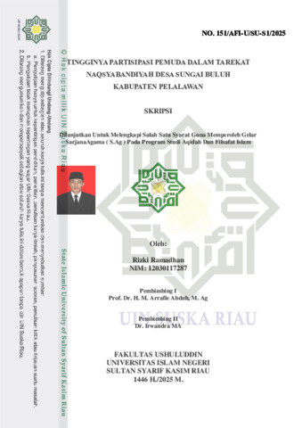 ABTRAK Penelitian ini dilatarbelakangi bahwa pemuda di Desa Sungai Buluh menunjukkan minat yang tinggi terhadap tarekat Naqsyabandiyah. Hal ini dibuktikan dengan meningkatnya jumlah peserta muda dalam kegiatan-kegiatan tarekat yang diadakan di masjid-masjid setempat. Mereka merasa bahwa tarekat memberikan manfaat yang nyata, terutama dalam menenangkan hati dan mengarahkan mereka untuk hidup lebih islami. Keterlibatan pemuda dalam pengembangan tarekat di Desa Sungai Buluh terlihat dari partisipasi aktif mereka dalam kegiatan tarekat, seperti zikir bersama, pengajian, dan kajian Islam. Penelitian ini merupakan penelitian lapangan dengan menggunakan teknik pengumpulan data observasi, wawancara, dan dokumentasi. Adapun informan dalam penelitian ini berjumlah 12 orang yang terdiri dari 2 orang informan kunci, 5 orang informan pokok dan 5 orang informan tambahan. Hasil penelitian menunjukkan Bentuk tingginya Partisipasi pemuda dalam Kegiatan Tarekat Naqsyabandiyah terdiri dari partisipasi dalam kegiatan Zikir dan partisipasi dalam kegiatan Tausiah. Kegiatan zikir yang dilakukan oleh pemuda Desa Sungai Buluh bukan hanya sekadar pengulangan lafaz, tetapi merupakan sarana untuk menenangkan hati dan mendekatkan diri kepada Allah. Partisipasi dalam zikir menjadi ruang bagi para pemuda untuk berinteraksi dalam suasana religius, menguatkan iman dan perasaan spiritual untuk membentengi pengaruh negatif lingkungan, media sosial dan kristenisasi. Faktor-faktor yang mendorong minat pemuda terhadap Tarekat Naqsyabandiyah terdiri dari faktor pengaruh lingkungan sosial dan pengaruh orangtua. Lingkungan sosial yang religius, di mana sebagian besar anggota masyarakat terlibat dalam kegiatan tarekat, memberikan motivasi kuat bagi pemuda untuk bergabung dalam kegiatan Tarekat Naqsyabandiyah. Lingkungan sosial mendukung mereka untuk menjadi bagian dari komunitas yang lebih besar yang memiliki nilai-nilai keagamaan yang sama. Pengaruh orang tua sejalan dengan konsep birrul walidain (berbakti kepada orang tua) dalam Islam, di mana orang tua memiliki kewajiban untuk mengarahkan anak-anak muda dalam kebaikan, termasuk dalam hal spiritual, moral, sosial dan ekonomi dari dampak negatif arus deras media sosial. Kata Kunci: Partisipasi, Tarekat, Tarekat Naqsyabandiyah