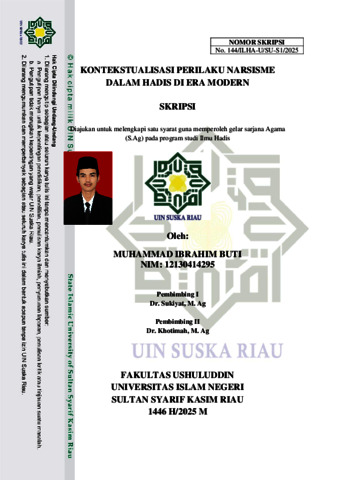 ABSTRAK Skripsi ini berjudul “Kontekstualisasi Perilaku Narsisme dalam Hadis di Era Modern” yang ditulis oleh Muhammad Ibrahim Buti, NIM 12130414295. Penelitian ini mengkaji fenomena meningkatnya perilaku narsistik dalam masyarakat modern, khususnya melalui media sosial, di mana individu sering menampilkan diri secara berlebihan demi memperoleh validasi dan pengakuan sosial. Gejala ini menimbulkan pertanyaan etis dan spiritual yang relevan untuk dikaji melalui perspektif hadis Nabi SAW. Rumusan Masalah bagaimana hadis-hadis Nabi menjelaskan tentang narsisme, dan bagaimana dampak narsisme di era modern. Penelitian ini menggunakan pendekatan kualitatif dengan metode studi pustaka (library research), yang menelusuri hadis-hadis dalam Kutub at-Tis‘ah serta literatur Islam klasik dan kontemporer. Hasil penelitian menunjukkan bahwa sikap seperti ujub (bangga diri), takabur (sombong), dan riya (pamer amal) merupakan bentuk narsisme yang telah dikecam dalam hadis-hadis Nabi karena bertentangan dengan nilai-nilai Islam seperti tawadhu’ (rendah hati) dan ikhlas. Hadis-hadis tersebut memperingatkan bahwa sifat-sifat ini dapat menggugurkan amal perbuatan dan menjauhkan seseorang dari ridha Allah SWT. Dalam konteks era digital, perilaku narsistik semakin meluas melalui media sosial, yang mendorong budaya pencitraan diri secara berlebihan. Konsep tawadhu’ yang diajarkan Nabi SAW menjadi solusi utama dalam menanggulangi perilaku ini, karena mencerminkan kesempurnaan iman dan menjadi pijakan etis dalam kehidupan bermedia sosial. Dengan demikian, kontekstualisasi hadis tentang narsisme relevan untuk membentuk karakter dan etika sosial umat Islam di era modern. Kata Kunci: Narsisme, Hadis, Media Sosial, Tawadhu’, Era Modern