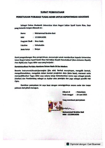 SURAT PERNYATAAN PERSETUJUAN PUBLIKASI TUGAS AKHIR UNTUK KEPENTINGAN AKADEMIS, MUHAMMAD IBRAHIM BUTI - MUHAMMAD IBRAHIM BUTI Ilmu Hadis S1.pdf Download (367kB) | Preview |