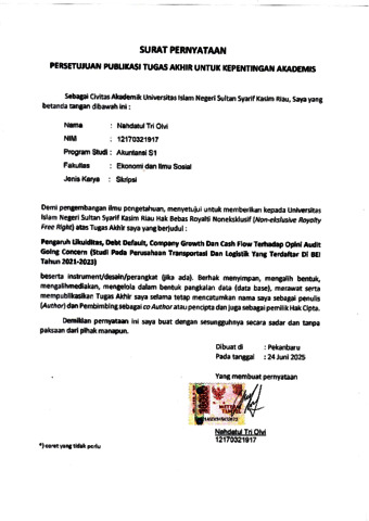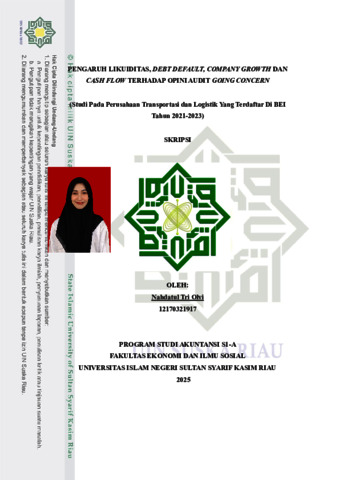 NAHDATUL TRI OLVI, - (2025) PENGARUH LIKUIDITAS, DEBT DEFAULT, COMPANY GROWTH DAN CASH FLOW TERHADAP OPINI AUDIT GOING CONCERN (STUDI PADA PERUSAHAAN TRANSPORTASI DAN LOGISTIK YANG TERDAFTAR DI BEI TAHUN 2021-2023). Skripsi thesis, UNIVERSITAS ISLAM NEGERI SULTAN SYARIF KASIM RIAU.