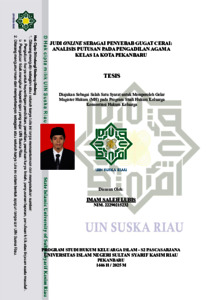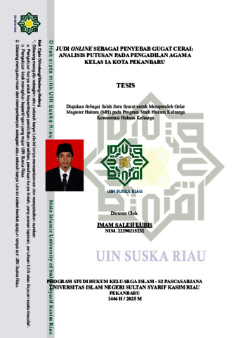 ABSTRAK Imam Saleh Lubis (2025): Judi Online sebagai Penyebab Gugat Cerai: Analisis Putusan pada Pengadilan Agama Kelas IA Kota Pekanbaru Salah satu sebab perceraian di Pengadilan Agama Kelas IA Kota Pekanbaru adalah akibat judi online. Kasus perceraian akibat judi online di Pengadilan Agama Kelas IA Kota Pekanbaru mengalami peningkatan dalam periode 2021- 2024. Tentunya ada pertimbangan hakim yang menjadikan judi online sebagai salah satu alasan perceraian. Penelitian ini merupakan penelitian kualitatif dengan jenis penelitian hukum empiris. Data penelitian dikumpulkan dengan teknik wawancara dan dokumentasi. Hasil penelitian menyimpulkan bahwa Judi online dapat memberikan dampak bagi keharmonisan rumah tangga, karena berdampak pada finansial rumah tangga, dan berdampak bagi psikologis suami dan istri seperti terjadinya perselisahan dan pertengakaran terus menerus. Namun judi online tidak menjadi satu-satunya alasan perceraian, terdapat berbagai alasan lain yang menjadi pertimbangan hakim. Pertimbangan hakim dalam memutuskan perceraian dengan alasan judi online adalah dengan mempertimbangkan dampak yang ditimbulkan oleh judi online itu atau sesuai kaidah masalahah mursalah. Selain itu ada pertimbangan hukum terkait kekhawatiran akan dampak yang ditimbulkan dari judi online tersebut, misalnya terjadinya kekerasan dalam rumah tangga, pertengkaran dan perselisihan secara terus menerus yang sulit didamaikan, dan kemudaratan yang ditimbulkan oleh judi online hingga berdampak pada keharmonisan rumah tangga. Putusan hakim dalam memutusakan cerai pada guatan cerai akibat judi online di Pengadilan Agama Kelas IA Kota Pekanbaru sudah sesuai dengan prinsip hukum Islam dan peraturan perundangan, yaitu sesuai Pasal 116 Kompilasi Hukum Islam dan pada Pasal 19 Peraturan Pemerintah Nomor 19 Tahun 1975 tentang Pelaksanaan Undang-undang Nomor 1 Tahun 1974 tentang Perkawinan. Kata Kunci: Judi Online, Gugat Cerai, Hukum Islam