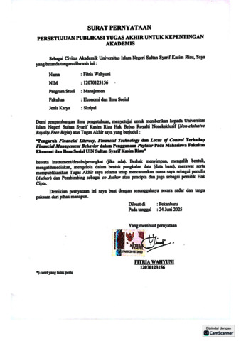 FITRIA WAHYUNI, - (2025) PENGARUH FINANCIAL LITERACY, FINANCIAL TECHNOLOGY DAN LOCUS OF CONTROL TERHADAP FINANCIAL MANAGEMENT BEHAVIOR DALAM PENGGUNAAN PAYLATER PADAMAHASISWA FAKULTAS EKONOMI DAN ILMU SOSIAL UIN SULTAN SYARIF KASIM RIAU. Skripsi thesis, UNIVERSITAS ISLAM NEGERI SULTAN SYARIF KASIM RIAU.