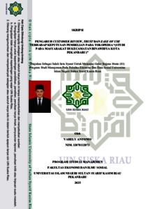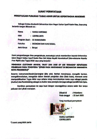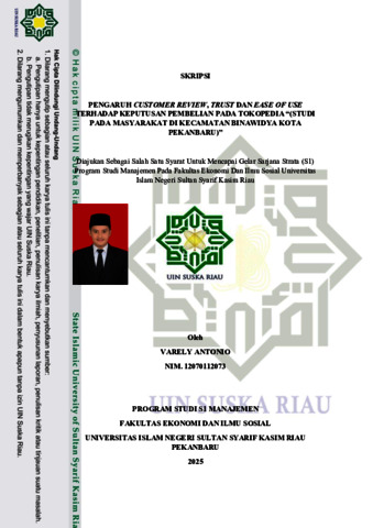 VARELY ANTONIO, - (2025) PENGARUH CUSTOMER REVIEW, TRUST DAN EASE OF USE TERHADAP KEPUTUSAN PEMBELIAN PADA TOKOPEDIA “(STUDI PADA MASYARAKAT DI KECAMATAN BINAWIDYA KOTA PEKANBARU)”. Skripsi thesis, UNIVERSITAS ISLAM NEGERI SULTAN SYARIF KASIM RIAU.