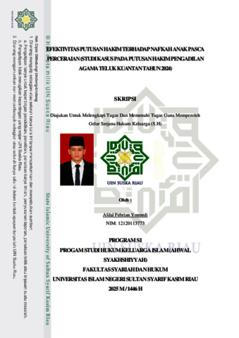 AFDAL FEBRIAN YONNEDI, - (2025) EFEKTIVITAS PUTUSAN HAKIM TERHADAP NAFKAHANAK PASCA PERCERAIAN (STUDI KASUSPADAPUTUSAN HAKIMPENGADILAN AGAMA TELUK KUANTAN TAHUN 2024). Skripsi thesis, UNIVERSITAS ISLAM NEGERI SULTAN SYARIF KASIM RIAU.