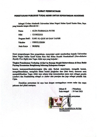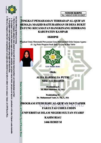 ALDA HARMALIA PUTRI, - (2025) TINGKAT PEMAHAMAN TERHADAP AL-QUR’AN REMAJA MASJID DI DESA BUKIT PAYUNG KECAMATAN BANGKINANG SEBERANG KABUPATEN KAMPAR. Skripsi thesis, UIN SUSKA.