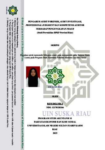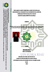THE EFFECT OF FORENSIC AUDIT, INVESTIGATION AUDIT, PROFESSIONAL JUDGMENT AND AUDITOR COMPETENCE ON FRAUD DISCLOSURE (Study of BPKP Representative of Riau Province) Oleh: Reni Delnika Nim: 12170320266 ABSTRAK Penelitian ini bertujuan untuk menganalisis pengaruh audit forensik, audit investigatif, professional judgment, serta kompetensi auditor terhadap tingkat pengungkapan kecurangan (fraud). Hipotesis yang diajukan dalam penelitian ini menyatakan bahwa audit forensik, audit investigatif, professional judgment, dan kompetensi auditor masing-masing memiliki pengaruh positif terhadap pengungkapan fraud. Penelitian ini mengadopsi pendekatan metode asosiatif dan menggunakan analisis koefisien determinasi sebagai teknik analisis datai. Populasi dalam penelitian mencakup auditor yang bertugas di Kantor BPKP Provinsi Riau, sementara sampel dipilih berdasarkan kriteria auditor yang telah memiliki pengalaman kerja minimal tiga tahun. Jenis data yang digunakan adalah data kuantitatif primer, yang diperoleh melalui penyebaran kuesioner kepada para auditor di kantor tersebut. Hasil penelitian menunjukkan bahwa keempat variabel—audit forensik, audit investigatif, professional judgment, dan kompetensi auditor memberikan pengaruh positif dan signifikan terhadap pengungkapan fraud.