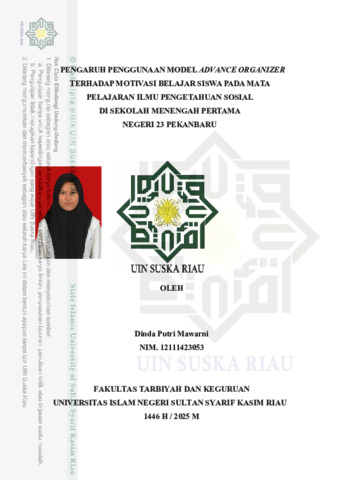 ABSTRAK Dinda Putri (2025): Pengaruh Penggunaan Model Advance Organizer Terhadap Motivasi Belajar Siswa Pada Mata Pelajaran Ilmu Pengetahuan Sosial di Sekolah Menengah Pertama Negeri 23 Pekanbaru. Penelitian ini bertujuan untuk mengetahui pengaruh yang signifikan antara penggunaan model advance organizer terhadap motivasi belajar siswa Sekolah Menengah Pertama Negeri 23 pekanbaru. Penelitian ini di latar belakangi oleh kurangnya keinginan untuk berhasil dan kurangnya dorongan dalam belajar. Penelitian ini menggunakan metode kuantitatif dengan pendekatan quasi eksperimen. Populasi dalam penelitian ini adalah seluruh siswa kelas IX yang berjumlah 290 orang. Sedangkan sampel penelitiannya terdiri dari 70 orang, yaitu kelas IX.6 yang berjumlah 35 orang sebagai kelas eksperimen dan IX.5 yang berjumlah 35 orang sebagai kelas kontrol dengan penarikan sampel menggunakan teknik purposive sampling. Pengumpulan data menggunakan angket, observasi dan dokumentasi. Analisis data yang digunakan adalah analisis hasil uji t pada penelitian ini dilakukan pengambilan Keputusan dengan membandingkan nilai signifikansi 0,001 < 0,05 terdapat perbedaan yang signifikan. Selanjutnya dengan membandingkan nilai t-hitung dan t-tabel yang diperoleh t-hitung > t-tabel atau (13,657 > 0,2352) yang berarti Ha diterima Ho ditolak. Pengaruh penggunaan model advance organizer terhadap motivasi belajar siswa pada mata pelajaran Ilmu Pengetahuan Sosial dapat dilihat hasil uji N-Gain sebesar 0,6005 kriteria sedang. Sehingga dapat disimpulkan adanya pengaruh yang signifikan antara penggunaan model advance organizer terhadap motivasi belajar siswa pada mata pelajaran Ilmu Pengetahuan Sosial di SMPN 23 Pekanbaru Kata Kunci: Model Advance Organizer, Motivasi Belajar, Ilmu Pengetahuan Sosial.