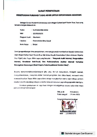 NURHOMSI DILA SAFITRI (2025) PENGARUH AUDIT INTERNAL, PENGENDALIAN INTERNAL, KESADARAN ANTI-FRAUD, DAN PROFESIONALISME AUDITOR INTERNAL TERHADAP PENCEGAHAN KECURANGAN (Studi Empiris Pada Inspektorat Provinsi Riau). Skripsi thesis, Universitas Islam Negeri Sultan Syarif Kasim Riau.