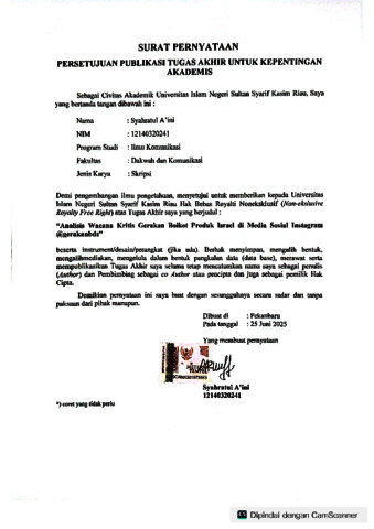 SYAHRATUL A’INI, - (2025) ANALISIS WACANA KRITIS GERAKAN BOIKOT PRODUK ISRAEL DI MEDIA SOSIAL INSTAGRAM @GERAKANBDS. Skripsi thesis, UNIVERSITAS ISLAM NEGERI SULTAN SYARIF KASIM RIAU.
