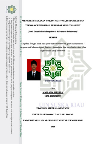 MAULANA SAPUTRA, - (2025) “PENGARUH TEKANAN WAKTU, MOTIVASI, INTEGRITAS DAN TEKNOLOGI INFORMASI TERHADAP KUALITAS AUDIT (Studi Empiris Pada Inspektorat Kabupaten Pelalawan)’’. Skripsi thesis, UNIVERSITAS ISLAM NEGERI SULTAN SYARIF KASIM RIAU.