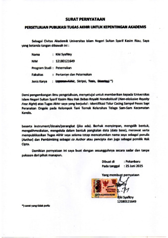 SURAT PERNYATAAN PUBILIKASI - KIKI SYAFITRY PETERNAKAN.pdf - Published Version Download (346kB) | Preview |