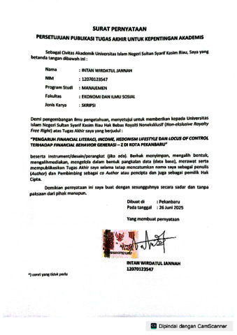 INTAN WIRDATUL JANNAH, - (2025) PENGARUH FINANCIAL LITERACY, INCOME, HEDONISM LIFESTYLE, DAN LOCUS OF CONTROL TERHADAP FINANCIAL BEHAVIOR GENERASI-Z DI KOTA PEKANBARU. Skripsi thesis, UNIVERSITAS ISLAM NEGERI SULTAN SYARIF KASIM RIAU.