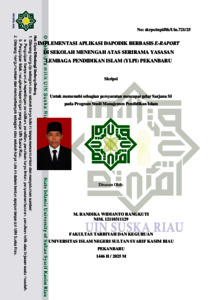 ABSTRAK M. Randika Widianto Rangkuti (2025): Implementasi Aplikasi Dapodik Berbasis E-Raport di Sekolah Menengah Atas Serirama Yayasan Lembaga Pendidikan Islam (YLPI) Pekanbaru Penelitian ini bertujuan untuk: 1) Mendeskripsikan Implementasi Aplikasi Dapodik Berbasis E-Raport di SMA Serirama YLPI Pekanbaru. 2) Mengetahui manfaat yang diperoleh dari penggunaan E-Raport. 3) Mengidentifikasi kendala yang muncul selama penerapan E-Raport. Pendekatan penelitian yang digunakan adalah kualitatif deskriptif dengan teknik pengumpulan data melalui observasi, wawancara, dan dokumentasi. Subjek penelitian yaitu: Tenaga pendidik. Fokus penelitian meliputi proses implementasi E-Raport yang mencakup tahapan perencanaan, pengorganisasian, pelaksanaan, dan pengawasan, serta manfaat dan kendala yang dihadapi dalam penerapannya. Hasil penelitian menunjukkan bahwa: 1) Implementasi E-Raport di SMA Serirama YLPI Pekanbaru telah dilakukan secara sistematis dan terintegrasi dengan sistem Dapodik di Ketahui dengan Perencanaan, pengorganisasian, pelaksanaan, dan pengawasan yang baik. 2) Manfaat utama yang dirasakan meliputi efisiensi waktu, kemudahan dalam penginputan nilai, serta peningkatan transparansi informasi akademik bagi orang tua dan siswa. 3) kendala utama yang dihadapi adalah keterbatasan infrastruktur teknologi, rendahnya kesiapan tenaga pendidik dalam menggunakan sistem digital, dan resistensi terhadap perubahan teknologi. Implikasi: diperlukan upaya sekolah dalam peningkatan kompetensi guru serta penguatan infrastruktur penunjang untuk mendukung keberhasilan sistem informasi manajemen berbasis E-Raport secara optimal. Kata Kunci: E-Raport, Aplikasi Dapodik, Implementasi.