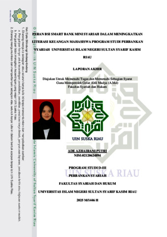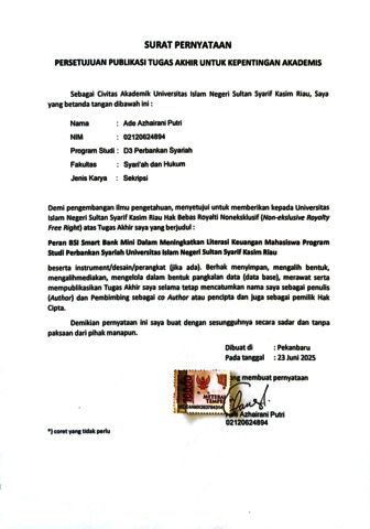ADE AZHAIRANI PUTRI, - (2025) PERAN BSI SMART BANK MINI SYARIAH DALAM MENINGKATKAN LITERASI KEUANGAN MAHASISWA PROGRAM STUDI PERBANKAN SYARIAH UNIVERSITAS ISLAM NEGERI SULTAN SYARIF KASIM RIAU. Laporan thesis, UNIVERSITAS ISLAM NEGERI SULTAN SYARIF KASIM RIAU.