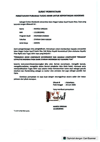 MAROLI SIREGAR, - (2025) PENGARUH GOOD CORPORATE GOVERNANCE DAN SHARIAH COMPLIANCE TERHADAP LOYALITAS NASABAH PADA BANK SYARIAH INDONESIA KCP GUNUNG TUA. Skripsi thesis, UNIVERSITAS ISLAM NEGERI SULTAN SYARIF KASIM RIAU.