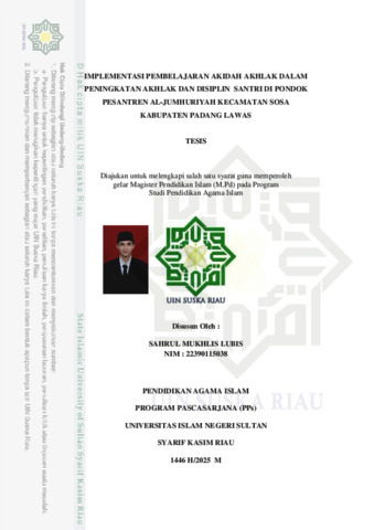 ABSTRAK Sahrul Mukhlis Lubis (2025) : Implementasi Pembelajaran Akidah Akhlak Dalam Peningkatan Akhlak Dan Disiplin Santri Di Pondok Pesantren Al-Jumhuriyah Kecamatan Sosa Kabupaten Padang Lawas Penelitian ini bertujuan untuk mengetahui implementasi pembelajaran Akidah Akhlak dalam peningkatan akhlak dan disiplin santri di Pondok Pesantren Al-Jumhuriyah, Kecamatan Sosa, Kabupaten Padang Lawas. Penelitian ini menggunakan metode deskriptif kualitatif dengan teknik pengumpulan data melalui observasi, wawancara, dan dokumentasi. Hasil penelitian ini menunjukkan bahwa: 1) Implementasi pembelajaran Akidah Akhlak dilakukan secara menyeluruh melalui tahapan perencanaan, pelaksanaan, dan evaluasi. Perencanaan mencakup koordinasi, penyusunan materi, serta integrasi nilai-nilai kedisiplinan ke dalam kegiatan pembelajaran dalam kehidupan sehari-hari. Pelaksanaan dilakukan melalui keteladanan, pembiasaan, dan pengawasan rutin, termasuk kegiatan seperti Yasinan, kajian malam, dan salat berjamaah. Evaluasi dilakukan melalui ujian komprehensif keagamaan yang menilai aspek akademik, sikap, dan kedisiplinan santri. 2) Faktor pendukung dan penghambat implementasi pembelajaran Akidah Akhlak dalam peningkatan akhlak dan disiplin santri di Pondok Pesantren Al-Jumhuriyah antara lain : Pertama, Faktor pendukungnya meliputi dukungan penuh dari orang tua, ketersediaan fasilitas pembelajaran seperti perpustakaan dengan koleksi kitab kuning dan buku-buku akhlak, program-program khusus seperti perimtak, serta pembiasaan ibadah harian dan bimbingan intensif dari para Pembina. Kedua, faktor penghambat meliputi perbedaan latar belakang santri, kurangnya minat dan semangat belajar, rendahnya kedisiplinan, serta terbatasnya pemahaman terhadap materi. Meskipun demikian, upaya penanaman nilai-nilai akhlak tetap dilakukan secara konsisten melalui pendekatan terpadu dan pembinaan berkelanjutan dalam lingkungan pesantren. Kata Kunci: Pembelajaran, Akidah Akhlak, Disiplin .
