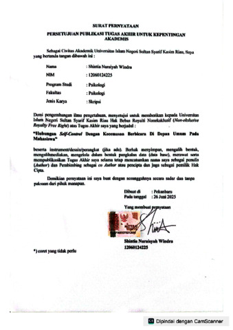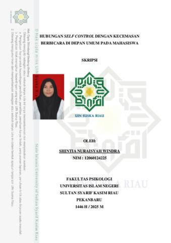 HUBUNGAN SELF CONTROL DENGAN KECEMASAN BERBICARA DI DEPAN UMUM PADA MAHASISWA Oleh : Shintia Nuraisyah Windra Fakultas Psikologi Universitas Islam Negeri Sultan Syarif Kasim Riau Shintianuraisyah73@mail.com ABSTRAK Kecemasan berbicara di depan umum merupakan suatu kondisi dimana ketidaknyamanan yang dirasakan oleh individu pada saat membayangkan atau sedang berbicara di depan banyak orang. Kondisi ini dapat terjadi pada mahasiswa, seperti saat presentasi, menyampaikan argument di forum organisasi. Self Control merupakan salah satu faktor yang dapat membantu mahasiswa menguasai kecemasan berbicara di depan umum. Penelitian ini bertujuan untuk mengetahui hubungan self control dengan kecemasan berbicara di depan umum pada mahasiswa. Subjek pada penelitian ini berjumlah sebanyak 220 orang mahasiswa yang didapat melalui Teknik random sampling. Pengumpulan data menggunakan skala Self Control skala adaptasi dari De Ridder et al. (2020), skala bahasa Inggris yang telah di adaptasi kedalam bahasa Indonesia oleh (Arifin & Milla, 2020) dan skala kecemasan berbicara di depan umum yang disusun oleh Annisa Fitria Sitorus Pane (2022) yang mengacu pada aspek kecemasan berbicara di depan umum yang di kemukakan oleh Semiun (2006). Berdasarkan analisis pearson product moment diperoleh hasil terdapat hubungan Self Control dan kecemasan di depan umum dengan nilai koefisien (r) sebesar -0,393 dan nilai signifikan 0,000 (p<0,01). Hal ini berarti semakin tinggi Self Control maka semakin rendah kecemasan berbicara di depan umum pada mahasiswa. Kata Kunci: self control, kecemasan berbicara di depan umum, mahasiswa