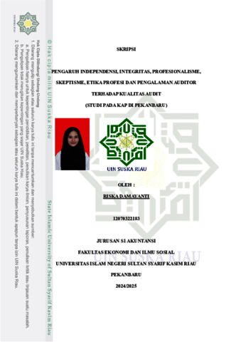 RISKA DAMAYANTI, - (2025) PENGARUH INDEPENDENSI, INTEGRITAS, PROFESIONALISME, SKEPTISME, ETIKA PROFESI DAN PENGALAMAN AUDITOR TERHADAP KUALITAS AUDIT (STUDI PADA KAP DI PEKANBARU). Skripsi thesis, UNIVERSITAS ISLAM NEGERI SULTAN SYARIF KASIM RIAU.