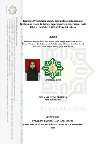 ABSTRAK PENGARUH PENGETAHUAN ZAKAT, RELIGIUSITAS, DIGITALISASI DAN PENDAPATAN USAHA TERHADAP KEPATUHAN MEMBAYAR ZAKAT PADA PELAKU UMKM DIBAZNAS KOTA PEKANBARU OLEH: MERY AGUSTINA MAHMUD 12170324137 Tujuan dari kajian ini untuk menganalisis pengaruh pengetahuan zakat, religiusitas, digitalisasi dan pendapatan usaha terhadap kepatuhan membayar zakat pada pelaku UMKM di BAZNAS Kota Pekanbaru. Metode yang digunakan pada penelitian yaitu menggunakan pendekatan kuantitatif, dengan menyebar kuesioner kepada responden merupakan pelaku UMKM yang membayar zakat di BAZNAS Kota Pekanbaru dengan sampel 52 responden. menggunakan metode probability sampling. Alat analisis yang digunakan adalah SPSS versi 25. Temuan dari penelitian ini adalah variabel pengetahuan zakat, religiusitas, digitalisasi dan pendapatan usaha secara keseluruhan berpengaruh positif terhadap kepatuhan membayar zakat. Koefisien determinasi (R2) sebesar 0,772 atau persentase 77,2%. Nilai koefisien determinan tersebut mengidentifikasikan bahwa pengaruh variabel independen terhadap variabel dependen sebesar 77,2%. Sisanya sebesar 22,8% dipengaruhi oleh variabel lain yang belum ada dalam penelitian ini. Kata kunci : Pengetahuan Zakat, Religiusitas, Digitalisasi pendapatan usaha dan kepatuhan membayar zakat