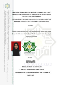 ABSTRAK PENGARUH PROFITABILITAS, ARUS KAS, LEVERAGE DAN SALES GROWTH TERHADAP FINANCIAL DISTRESS DENGAN LIKUIDITAS SEBAGAI VARIABEL MODERASI (STUDI EMPIRIS PADA PERUSAHAAN MANUFAKTUR SUB SEKTOR KERAMIK, PORSELEN DAN KACA DI BEI TAHUN 2017-2023) OLEH: DEVI SULASTRI NIM 12170320138 Penelitian ini adalah penelitian kuantitatif yang bertujuan untuk mengetahui bagaimana pengaruh profitabilitas, arus kas, leverage dan sales growth terhadap financial distress dengan likuiditas sebagai variabel moderasi. Penelitian ini dilakukan pada perusahaan manufaktur sub sektor keramik, porselen dan kaca di Bursa Efek Indonesia tahun 2017-2023. Jumlah sampel dalam penelitian ini sebanyak 7 perusahaan dengan metode penarikan sampel menggunakan metode purposive sampling. Penelitian ini menggunakan data sekunder yang diperoleh melalui laporan tahunan perusahaan. Analisis data menggunakan regresi data panel dengan menggunakan eviews 12. Hasil analisis regresi data panel menunjukan variabel profitabilitas berpengaruh positif terhadap financial distress, sedangkan variabel arus kas, leverage dan sales growth tidak berpengaruh terhadap financial distress. Likuiditas mampu memoderasi pengaruh profitabilitas terhadap financial distress, namun likuiditas tidak mampu memoderasi arus kas, leverage dan sales growth terhadap financial distress. Kata Kunci : Profitabilitas, Arus kas, Leverage, Sales Growth, Financial Distress, Likuiditas