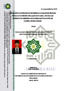 ABSTRAK Ridhowal (2025): Implementasi Program Pendidikan Karakter Proyek Penguatan Profil Pelajar Pancasila (P5) Dalam Kurikulum Merdeka Di MTs Fadhilah Pekanbaru Penelitian ini menggunakan pedekatan kualitatif dengan metode deskriptif. Penelitian ini bertujuan untuk mengetahui: 1) Menganalisis bagaimana implementasi program pendidikan karakter P5 dalam kurikulum merdeka di MTs Fadhilah Pekanbaru, dan 2) Menganalisis apa saja faktor pendukung dan penghampat dalam implementasi program pendidikan karakter P5 dalam kurikulum merdeka di MTs Fadhilah Pekanbaru. Data dikumpulkan melalui wawancara, observasi, dan dokumentasi yang melibatkan beberapa subjek penelitian di antaranya, wakil kepala sekolah bidang kurikulum, wakil kepala sekolah bidang kesiswaan, serta guru sebagai informan penelitian. Objek dari penelitian ini adalah implementasi program pendidikan karakter dalam membentuk generasi yang berkualitas. Hasil penelitian menyatakan bahwa: 1) Tahapan-tahapan dalam siklus implementasi program pendidikan karakter P5 dalam kurikulum merdeka di MTs Fadhilah Pekanbaru sebagai berikut, a) perencanaan program dirancang secara kolaboratif dan partisipatif antar pihak sekolah dan stakeholder, b) pelaksanaan program dilaksanakan melalui kegiatan intrakurikuler dan ekstrakurikuler, c) evaluasi dilakukan secara menyeluruh dan reflektif. 2) Faktor pendukung dan penghambat implementasi program pendidikan karakter di MTs Fadhilah Pekanbaru yaitu, a) faktor pendukung diantaranya, lingkungan madrasah yang kondusif, dukungan dari kepala madrasah, guru, komite, orang tua, dan motivasi siswa yang tinggi. Sedangkan, b) faktor penghambat antara lain, keterbatasan sember daya, kurangnya pemahaman guru terhadap pentingnya pendidikan karakter, serta adanya resistensi terhadap perubahan dari beberapa pihak. Temuan ini menegaskan bahwa keberhasilan implementasi program pendidikan karakter sangat bergantung pada peran guru yang aktif dan konsisten dalam menyampaikan nilai-nilai karakter, dukungan dari pihak sekolah, orang tua, serta lingkungan yang kondusif. Kata kunci: Implementasi, program pendidikan, karakter