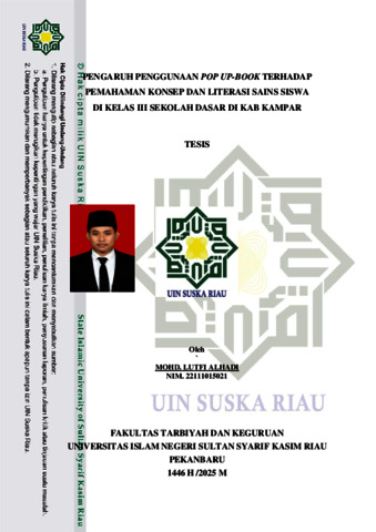 ABSTRAK Mohd. Lutfi Alhadi (2025): Pengaruh Media Pop Up-Book Terhadap Pemahaman Konsep Dan Literasi Sains Peserta Didik Kelas III Sekolah Dasar Penelitian ini bertujuan untuk menentukan pengaruh Pop Up-Book terhadap pemahaman konsep dan literasi sains peserta didik kelas III sekolah dasar. Penelitian ini menggunakan Metode penelitian ini menggunakan quasi experiment atau eksperimen semu, yaitu metode eksperimen yang tidak memungkinkan peneliti melakukan pengontrolan penuh terhadap variabel dan kondisi eksperimen seperti keadaan peserta didik dan kegiatan peserta didik selama di sekolah. Subjek penelitian ini adalah UPT SDN 016 Ranah dan UPT SDN 010 sawah dan objek penelitian ini Pop Up-Book terhadap pemahaman konsep dan literasi sains kelas III sekolah dasar. Hasil penelitian menunjukkan bahwa terdapat perbedaan kemampuan pemahaman konsep yang diberikan perlakuan menggunakan media pop up book dengan peserta didik yang diberikan perlakuan buku ajar nasional dengan t hitung 8.738 dengan nilai rata-rata di UPTD SDN 016 Bukit Ranah 85.82 dan UPTD SDN 010 Sawah 85.42. Terdapat perbedaan literasi sains antara peserta didik yang diberikan perlakuan dengan menggunakan pop up book dengan peserta didik yang diberikan dengan perlakuan diberikan buku ajar nasioanal pada UPTD SDN 016 Bukit Ranah dengan t hitung 8.297 dengan rata-rata kelas eksperimen 85.64 dan kontrol 68.37 dengan dan UPTD SDN 010 Sawah dengan t hitung 8.297. tedapat perbedaan rata-rata diantara kedua kelas tersebut, yang didominasi kelas eksperimen dengan yang menggunakan pop up book lebih tinggi dibandingkan dengan kelas kontrol membuktkan bahwa media pop up book berpengaruh terhadap pemahaman dan literasi sains. Kata kunci: Pop-up Book, Pemahaman konsep, Literasi Sains