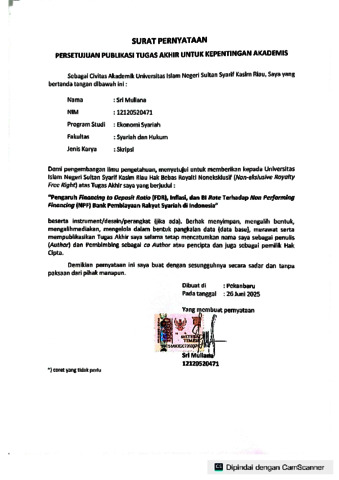 SRI MULIANA, - (2025) PENGARUH FINANCING TO DEPOSIT RATIO (FDR), INFLASI, DAN BI RATE TERHADAP NON PERFORMING FINANCING (NPF) BANK PEMBIAYAAN RAKYAT SYARIAH DI INDONESIA. Skripsi thesis, UIN SUSKA.