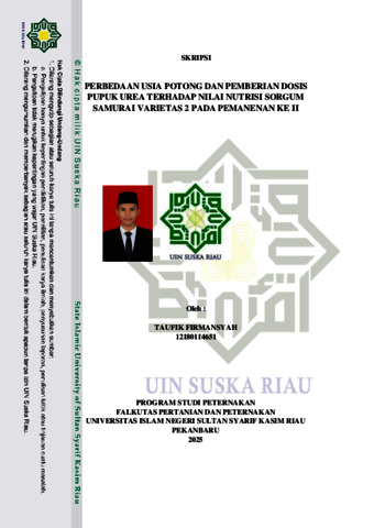TAUFIK FIRMANSYAH, - (2025) PERBEDAAN USIA POTONG DAN PEMBERIAN DOSIS PUPUK UREA TERHADAP NILAI NUTRISI SORGUM SAMURAI VARIETAS 2 PADA PEMANENAN KE II. Skripsi thesis, UNIVERSITAS ISLAM NEGERI SULTAN SYARIF KASIM RIAU.