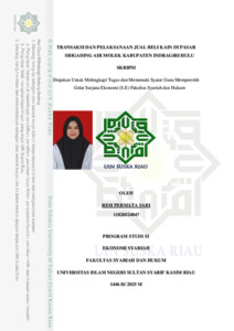 ABSTRAK Resi Permata Sari : Transaksi dan Pelaksanaan Jual Beli Kain Di Pasar Srigading Air Molek Kabupaten Indragiri Hulu Pasar tradisional seperti Pasar Srigading Air Molek masih menjadi pusat kegiatan ekonomi masyarakat lokal, terutama dalam jual beli kain yang sering dilakukan secara langsung antara penjual dan pembeli. Namun dalam praktiknya, masih ditemukan ketidaksesuaian antara transaksi jual beli dengan prinsip-prinsip syariah, terutama dalam pelaksanaan hak-hak jual beli seperti khiyar. Hal ini menjadi dasar penting untuk dilakukan kajian lebih lanjut. Penelitian ini bertujuan untuk menganalisis transaksi dan pelaksanaan jual beli kain di Pasar Srigading Air Molek, Kabupaten Indragiri Hulu. Adapun rumusan masalah dalam penelitin ini adalah bagaimana transaksi dan pelaksanaan jual beli kain di Pasar Srigading Air Molek Kabupaten Indragiri Hulu, apa kendala Transaksi dan Pelaksanaan Jual Beli kain di Pasar Srigading Air Molek, Kabupaten Indragiri Hulu, dan Bagaimana pelaksanaan transaksi dan pelaksanaan jual beli kain dalam ekonomi syariah di Pasar Srigading Air Molek Kabupaten Indragiri Hulu Penelitian ini menggunakan metode kualitatif deskriptif dengan pendekatan studi lapangan, melalui observasi, wawancara, dan dokumentasi. Hasil penelitian menunjukkan bahwa penerapan transaksi dan pelaksanaan jual beli kain di Pasar Srigading telah dilaksanakan meskipun belum sepenuhnya optimal. Jenis transaksi dan pelaksanaan jual beli yang ditemukan meliputi transaksi dan pelaksanaan jual beli majlis, transaksi dan pelaksanaan jual beli syarat, dan transaksi dan pelaksanaan jual beli aib. Pedagang umumnya memberikan kesempatan kepada pembeli untuk mempertimbangkan kembali transaksi sebelum akad disahkan. Dalam kasus pembelian grosir yang ditemukan cacat barang, pembeli diperbolehkan menukar atau mengembalikan barang. Hal ini mencerminkan penerapan prinsip ta’awun (tolong-menolong) dalam praktik ekonomi syariah. Kendala dalam pelaksanaan transaksi dan pelaksanaan jual beli minimnya pemahaman teoretis dari para pelaku pasar mengenai konsep transaksi dan pelaksanaan jual beli, jenis-jenisnya, dan penerapannya secara syariah, tidak adanya kesepakatan tertulis, kurangnya pemeriksaan barang oleh pembeli, tekanan ekonomi dan persaingan pasar. Hal ini menyebabkan praktik transaksi dan pelaksanaan jual beli tidak berjalan secara optimal dan cenderung bergantung pada kebiasaan tanpa dasar pemahaman yang cukup. Oleh karena itu, diperlukan peningkatan literasi fiqh muamalah di kalangan pelaku usaha agar prinsip-prinsip syariah dapat dijalankan secara lebih sempurna. Kata Kunci: Jual Beli, Kain, Transaksi dan Pelaksanaan Jual Beli, Ekonomi Syariah