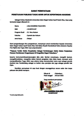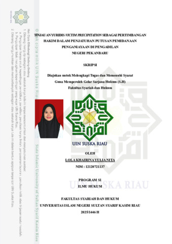 LOLA KHAIRINA YULIA NITA, - (2025) TINJAUAN YURIDIS VICTIM PRECIPITATION SEBAGAI PERTIMBANGAN HAKIM DALAM PENJATUHAN PUTUSAN PEMIDANAAN PENGANIAYAAN DI PENGADILAN NEGERI PEKANBARU. Skripsi thesis, UNIVERSITAS ISLAM NEGERI SULTAN SYARIF KASIM RIAU.