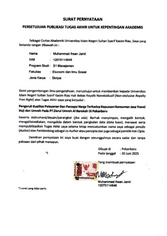 MUHAMMAD IHSAN JAMIL, - (2025) PENGARUH KUALITAS PELAYANAN DAN PERSEPSI HARGA TERHADAP KEPUASAN KONSUMEN JASA TRAVEL HAJI DAN UMROH PADA PT.DARUL UMROH AL BAROKAH DI PEKANBARU. Skripsi thesis, UNIVERSITAS ISLAM NEGERI SULTAN SYARIF KASIM RIAU.
