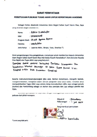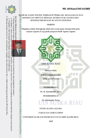 ABSTRAK Skripsi ini membahas tentang “Dampak Game Online Terhadap Perilaku Keagamaan Dan Kesehatan Mental Remaja Di Desa Suka Damai Kecamatan Singingi Hilir Kabupaten Kuantan Singingi” penelitian ini diawali oleh latar belakang tentang maraknya Game Online yang dilakukan oleh para remaja yang bermain game secara berlebihan cenderung memiliki waktu yang terbatas untuk menjalankan aktivitas keagamaan . Karena itu penelitian ini memberikan dua pokok permasalahan yaitu: Apa dampak game online terhadap perilaku keagaman dan kesehatan mental remaja didesa Suka Damai Kec. Singingi Hilir Kab. Kuantan Singingi. Dan Apa saja faktor yang mempengaruhi dampak game online terhadap perilaku keagamaan dan kesehatan mental remaja di desa Suka Damai Kec. Singingi Hilir Kab. Kuantan Singingi. Fokus penelitian ini adalah Dampak bermain game online terhadap perilaku keagamaan dan kesehatan mental remaja Desa Suka Damai. Banyak remaja yang menggunakan game melalui handphone sehingga mereka lupa waktu saat bermain game online, yang pada akhirnya mempengaruhi kedisiplinan mereka. Jenis penelitian ini adalah field research menggunakan metode kualitatif, sedangkan pengumpulan data dilakukan dengan menggunakan metode observasi, wawancara, dan dokumentasi. Objek dan subjek penelitiannya meliputi: Remaja Dusun Muara Jaya yang aktiv bermain game online, ketua pemuda, orang tua, kepala desa Suka Damai. Hasil dari penelitian ini menunjukan bahwa pertama: Game online memiliki dampak yang signifikan terhadap perilaku keagamaan dan kesehatan mental remaja di Desa Suka Damai. Di satu sisi, permainan ini dapat mengalihkan perhatian remaja dari aktivitas keagamaan, mengurangi frekuensi ibadah, dan mempengaruhi nilai-nilai moral yang dianut. Di sisi lain, game online juga dapat menyebabkan masalah kesehatan mental, seperti kecemasan, depresi, dan ketergantungan, terutama jika remaja menghabiskan waktu berlebihan dalam bermain. Kedua faktor yang mempengaruhi terjadinya dampak bermain game bagi remaja adalah: kurangnya tertanam jiwa agama pada setiap remaja, kurangnya kesadaran orang tua akan pentingnya pendidikan moral sejak dini, banyaknya remaja yang melalaikan budi pekerti, kurang terjalinnya kedekatan yang kurang baik dengan orang tuanya, kurang adanya bimbingan untuk mengisi waktu luang. Kata Kunci: Game Online, Perilaku Keagamaan, Remaja