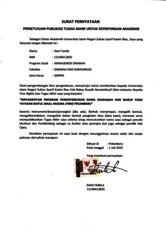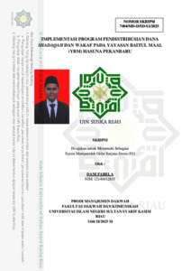 DANI FARELA, - (2025) IMPLEMENTASI PROGRAM PENDISTRIBUSIAN DANA SHADAQAH DAN WAKAF PADA YAYASAN BAITUL MAAL (YBM) HASUNA PEKANBARU. Skripsi thesis, UNIVERSITAS ISLAM NEGERI SULTAN SYARIF KASIM RIAU.