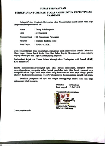 TATANG AZIZ PANGESTU, - (2025) OPTIMALISASI PAJAK AIR TANAH DALAM MENINGKATKAN PENDAPATAN ASLI DAERAH (PAD) KOTA PEKANBARU. Skripsi thesis, UNIVERSITAS ISLAM NEGERI SULTAN SYARIF KASIM RIAU.