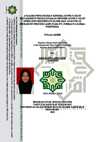 ERVIKA DWI AFRIYANTI, - (2025) ANALISIS PENGUKURAN KINERJA SUPPLY CHAIN MANAGEMENT MENGGUNAKAN METODE SUPPLY CHAIN OPERATION REFERENCE (SCOR) DAN ANALYTICAL HIERARCHY PROCESS (AHP) PADA PT. INDRACO GLOBAL INDONESIA. Skripsi thesis, UNIVERSITAS ISLAM NEGERI SULTAN SYARIF KASIM RIAU.