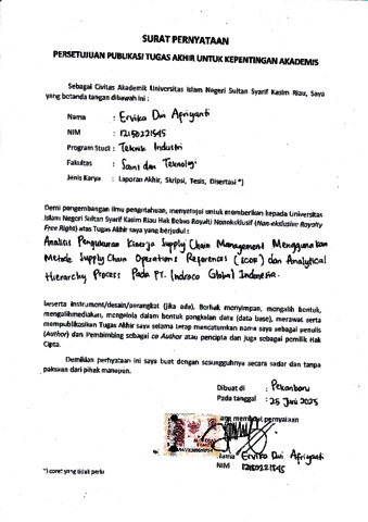 ANALISIS PENGUKURAN KINERJA SUPPLY CHAIN MANAGEMENT MENGGUNAKAN METODE SUPPLY CHAIN OPERATION REFERENCE (SCOR) DAN ANALYTICAL HIERARCHY PROCESS (AHP) PADA PT. INDRACO GLOBAL INDONESIA ERVIKA DWI AFRIYANTI NIM : 12150221545 Jurusan Teknik Industri Fakultas Sains dan Teknologi Universitas Islam Negeri Sultan Syarif Kasim Riau Jl. HR. Soebrantas Km. 15 No. 155, Pekanbaru ABSTRAK Pengukuran kinerja rantai pasok menjadi salah satu hal yang penting untuk mengetahui tingkat kematangan manajemen rantai pasok pada suatu perusahaan. PT. Indraco Global Indonesia bergerak di bidang industri pengolahan kopi dengan memproduksi dan mengekspor bubuk kopi. PT. Indraco Global Indonesia memiliki permasalahan pada rantai pasok perusahaan yang mempengaruhi kelancaran produksi perusahaan. Penelitian ini bertujuan untuk mengetahui indikator kinerja yang digunakan perusahaan dengan menggunakan metode SCOR, menganalisis bobot masing-masing indikator dengan menggunakan metode AHP, dan memberikan saran perbaikan agar kinerja manajemen rantai pasok perusahaan dapat lebih maksimal. Responden yang digunakan dalam penelitian ini sebanyak satu orang yaitu manajer operasional perusahaan yang dianggap paling memahami kondisi rantai pasok perusahaan. Metode penelitian yang digunakan adalah kuantitatif dengan menggunakan kuesioner Supply Chain Operation Reference (SCOR) dan Analytical Hierarchy Process (AHP). Hasil penelitian menunjukkan bahwa terdapat permasalahan pada indikator kinerja ketepatan peramalan, ketepatan perencanaan bahan baku, cacat produk dari produksi, dan tingkat pengembalian dari pelanggan. Kata Kunci : Supply Chain Management, Supply Chain Operation References, Analytical Hierarchy Process, Key Performance Indicator.