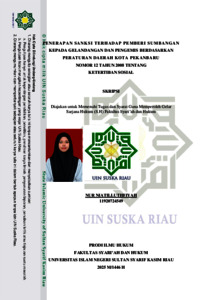 NUR NIATILLUTHFIYAH(2025) : PENERAPAN SANKSI TERHADAP PEMBERI SUMBANGAN KEPADA GELANDANGAN DAN PENGEMIS BERDASARKAN PERATURAN DAERAH KOTA PEKANBARU NOMOR 12 TAHUN 2008 TENTANG KETERTIBAN SOSIAL,,,,Gelandangan dan pengemis di Kota Pekanbaru jumlahnya terus bertambah, mereka berada di jalan raya, jalur hijau, persimpangan lampu merah, jembatan penyeberangan, dan di tempat-tempat umum. Pemerintah Kota Pekanbaru telah mengeluarkan Peraturan Daerah Nomor 12 Tahun 2008 Tentang Ketertiban Sosial, yang melarang melakukan pengemisan dan gelandangan. Demikian juga melarang setiap orang memberikan sumbangan dalam bentuk uang atau barang kepada gelandangan dan pengemis. Namun kenyataan di lapangan masih ada masyarakat atau pengendara yang memberikan sumbangan kepada gelandangan dan pengemis, hal ini dapat mendatangkan permasalahan karena jumlah pengemis dan gelandangan dapat bertambah. Oleh karena itu penulis membahas tentang penerapan sanksi pidana terhadap pemberi sumbangan kepada pengemis dan gelandangan berdasarkan Peraturan Daerah Nomor 12 Tahun 2008. Penelitian ini adalah penelitian hukum sosiologis, dengan pendekatan peraturan perundang-undangan. Lokasi penilitian ini adalah di Persimpangan Lampu Merah Garuda Sakti dan Persimpangan Lampu Merah Tabek Gadang Kota Pekanbaru. Sumber data yang digunakan adalah data primer dan data sekunder. Adapun teknik pengumpulan data yaitu observasi, wawancara, dan dokumentasi. Sedangkan analisis data dalam penelitian ini adalah analisis secara deskriptif. Dari hasil penelitian dapat diketahui, bahwa penerapan sanksi terhadap pemberi sumbangan kepada gelandangan dan pengemis di Kota Pekanbaru tidak pernah diterapkan, karena Satpol PP Kota Pekanbaru tidak melakukan penertiban dan tidak pernah memberikan sanksi kepada pemberi sumbangan, sebagaimana yang dijelaskan dalam Pasal 29 Peraturan Daerah Nomor 12 Tahun 2008, karena dalam kenyataannya masyarakat Kota Pekanbaru masih saja memberikan sumbangan kepada gelandangan dan pengemis. Kendala dalam penerapan sanksi terhadap pemberi sumbangan, antara lain karena sulitnya melakukan pengawasan terhadap pemberi sumbangan, karena luasnya wilayah yang harus diawasi. Kemudian kurangnya dukungan dari masyarakat untuk tidak memberikan sumbangan, serta sulitnya menertibkan pemberi sumbangan, sehingga sanksi sebagaimana yang dijelaskan dalam pasal 29 Peraturan Daerah Nomor 2008 tidak dapat diterapkan, karena tidak adanya bukti untuk menjatuhkan sanksi kepada pemberi sumbangan. Kata Kunci: Penerapan, Sanksi, Pemberi, Sumbangan, Gelandangan dan Pengemis