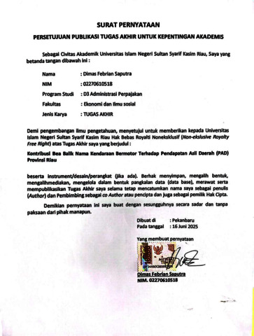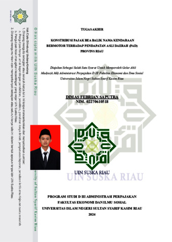 DIMAS FEBRIAN SAPUTRA, - (2025) KONTRIBUSI PAJAK BEA BALIK NAMA KENDARAAN BERMOTOR TERHADAP PENDAPATAN ASLI DAERAH (PAD) PROVINSI RIAU. Skripsi thesis, UNIVERSITAS ISLAM NEGERI SULTAN SYARIF KASIM RIAU.
