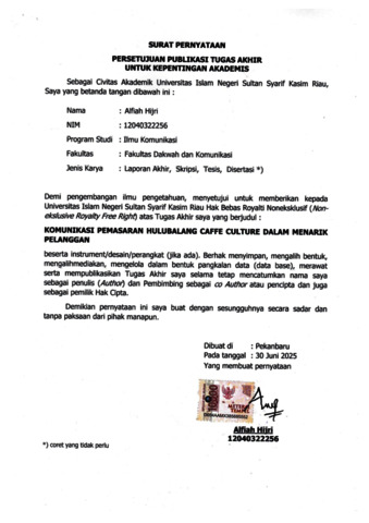 ALFIAH HIJRI, - (2025) KOMUNIKASI PEMASARAN HULUBALANG CAFFE CULTURE DALAM MENARIK PELANGGAN. Skripsi thesis, UNIVERSITAS ISLAM NEGERI SULTAN SYARIF KASIM RIAU.